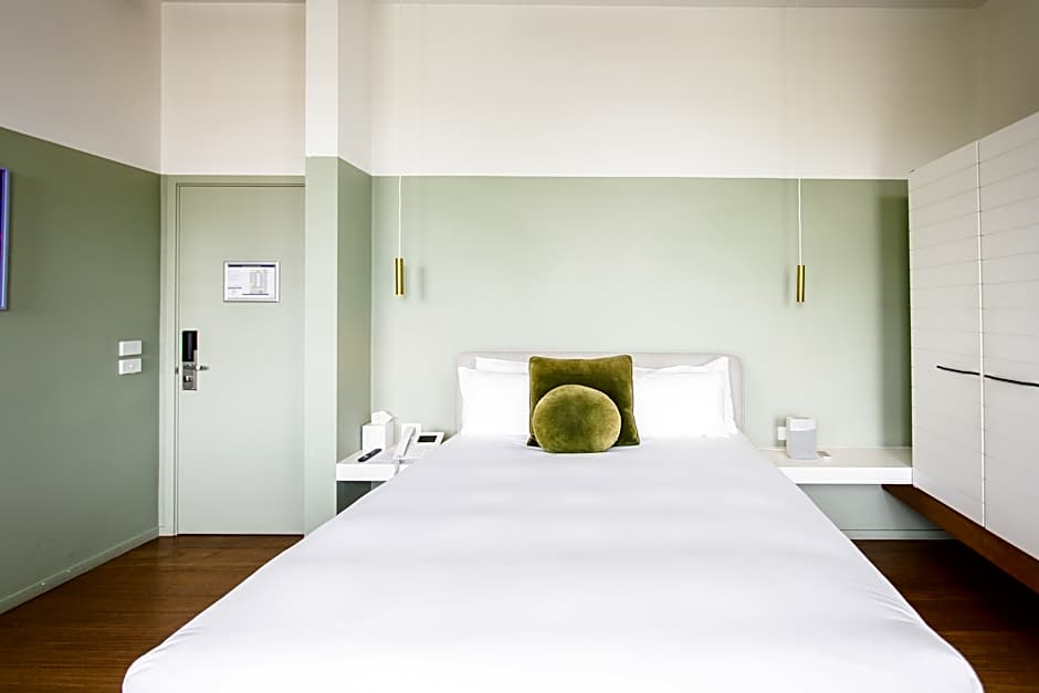 The deluxe room features a queen-size bed and a bathroom with walk-in shower. Most deluxe rooms face inwards, but some enjoy views of the street.